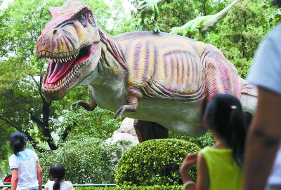 7月16日,北京市民在陶然亭公园内与1:1比例的仿真暴龙合影。当日,为期40天的2015年陶然亭公园恐龙科普展开幕,展出的40条仿真恐龙为三叠纪、侏罗纪、白垩纪三个时期具有代表性的恐龙种类,并配有详细的图文解说。(记者 孙戉摄 )