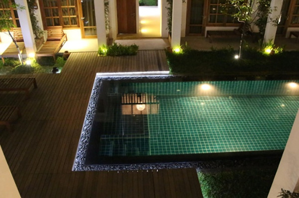 现代时尚的风格的酒店是琅勃拉邦中心的一道亮丽风景线:以黑白为主色调的装修风格打造一种成熟睿智和深邃;用蓝绿色瓦片铺成的露天游泳池凸显的轻松愉悦之感。住房的超大软床上灰色、银色、木炭色自成一格。卫生间配置泰式铜制水槽,宽大的浴缸带有可爱的莲蓬喷头,粉刷亮漆的混凝土墙更是让卫生间也如天堂一般。日落时,在花园餐厅的瀑布旁享用晚餐后便可骑着自行车到寺庙祈求福气,到法国殖民咖啡馆感受过去。夜深时便在柔软的巧克力色编织大床上进入梦乡。