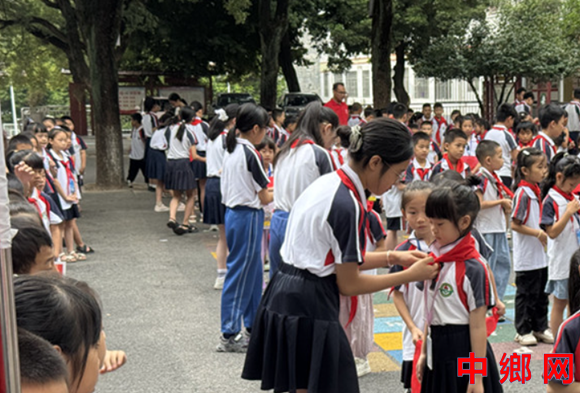 随后,大队辅导员罗怡老师宣布新队员和优秀队员名单。老队员为新队员系上红领巾,新队员们脸上满是自豪。田耀娟副校长对新队员提出希望,鼓励他们以红领巾为荣耀,好好学习、积极向上。陈诗琪同学带领新队员庄严宣誓,队员们的誓言坚定有力。罗怡老师带领全体队员呼号,“时刻准备着”的呼号声振奋人心。