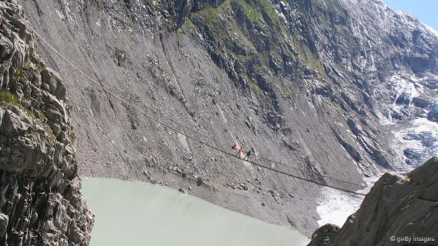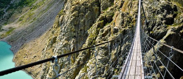 在所有悬索桥中,最令人惊心动魄的应该就是特里夫特悬索桥了。该桥长170米,跨伯尔尼高地的特里夫特斯湖,湖面与桥之间无任何连接,湖光山色冰川美景尽收眼底,每年吸引着成千上万名渡桥者前来游览。