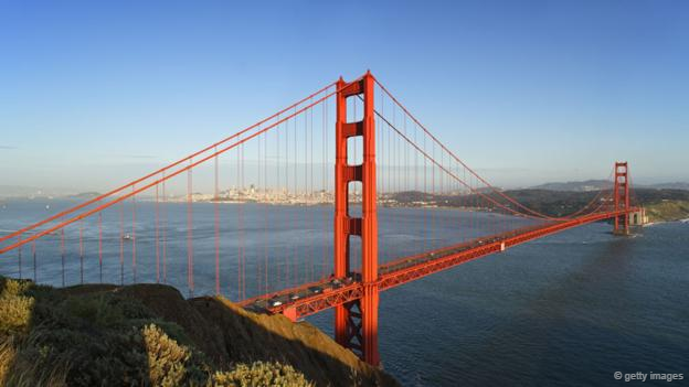 位于美国旧金山的金门大桥是世界著名的桥梁之一,也是近代桥梁工程的一项奇迹。大桥雄峙于美国加利福尼亚州长1900多米的金门海峡之上,历时4年,利用10万多吨钢材,耗资达3550万美元建成。桥长共2.7公里,桥体为橙色,跨度惊人。该桥于1937年对外开放,由工程师兼诗人约瑟夫·施特劳斯设计,其讲究的悬架结构和优美的艺术装饰塔令人赞叹不已。