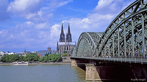 科隆霍亨索伦桥始建于第一次世界大战前,该桥设计独特,体现了当时石材工程与钢铁结构的完美结合。大桥于1911年完工,桥长共409米,横跨莱茵河。1945年3月,为了减缓盟军向柏林行进的速度,桥梁被德军炸毁。现在该桥已被成功修缮并成为德国最繁忙的铁路线路。桥上的钢铁结构形似鲸鱼的脊背,栅栏上挂满了情侣们的“爱情锁”。如今这座桥已经成为团结和爱的象征。