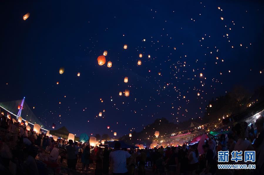 当日,各族群众和国内外游客在云南西双版纳景洪市澜沧江畔放飞孔明灯,喜迎傣历1378年新年。