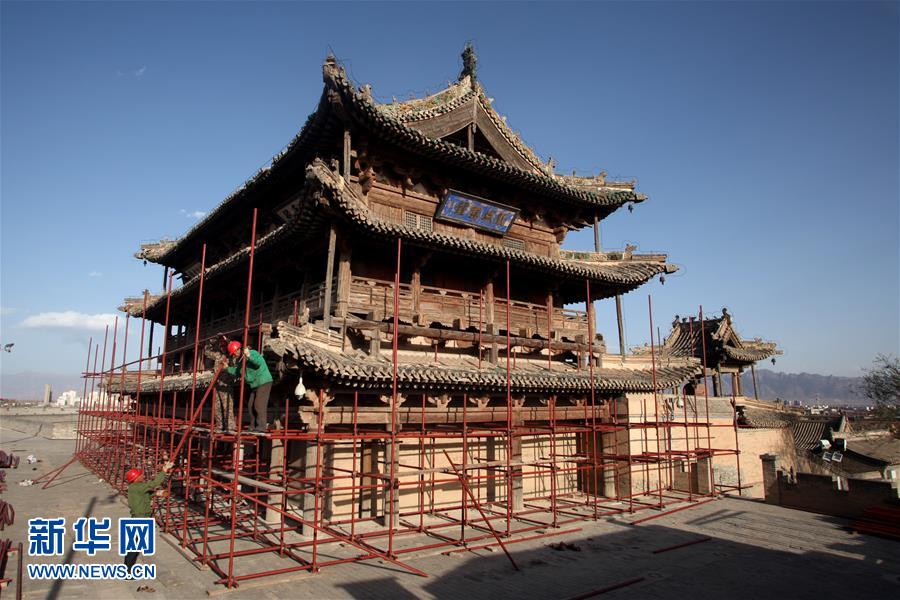 4月13日,工作人员对全国重点文物保护单位蔚县玉皇阁进行保护性维修。河北省张家口市蔚县是历史文化名城,该县2016年继续投入专项资金,按照科学规划、修旧如旧的原则,对辖区内的西古堡寺庙群、玉皇阁、常平仓等文物古建筑进行保护性维修。新华社发(武殿森 摄)