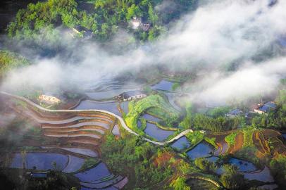 4月18日清晨,宜宾市江安县大井镇连天山森林公园的游客见到了久违的 “云海苍山雾似雪,如梦似幻仙境来”云海奇观,薄雾环绕大小不一的山丘,田间农舍若隐若现分布其间,宛若仙境。本报记者 何海洋 摄