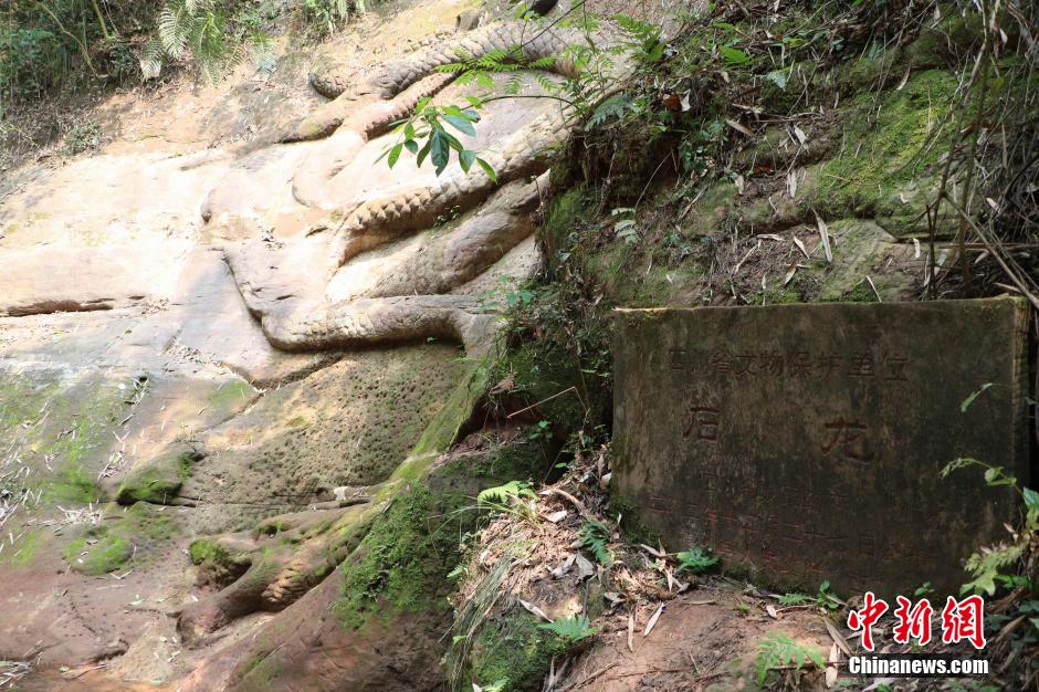 5月5日,位于四川省眉山市彭山区江口镇石龙村西的“江口石龙”,经过近2个月的保护性施工已重现“真颜”并开始迎客。“江口石龙”始建于宋代,距今已有千年历史。石龙身长17.4米、身径0.7米,静卧于红山石壁,鳞甲披露、曲折盘环。作为四川省级保护文物的“江口石龙”由于多年来的风吹雨浸,不仅被淤泥覆盖,而且表面长满了杂草。为了让石龙重见天日,彭山区从今年3月开始启动了维修和保护工作。 中新社发 通讯员刘树军 摄