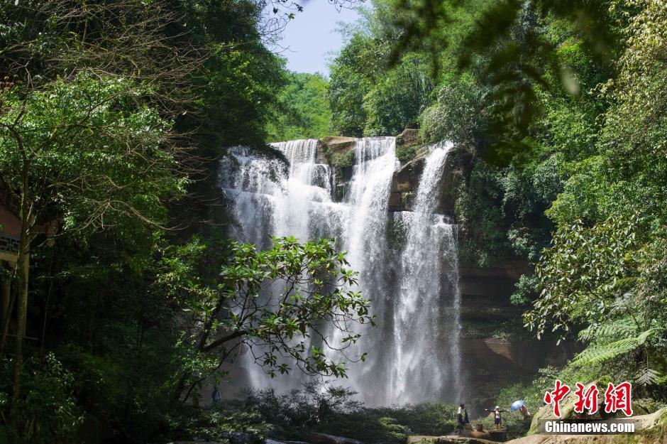 5月10日,游客在四洞沟瀑布群游览。当日,第11届贵州省旅游产业发展大会在仁怀市开幕。本次大会分会场之一的赤水市,由于刚降暴雨,四洞沟景区瀑布群水流增大,壮观景色迎来游客高峰。