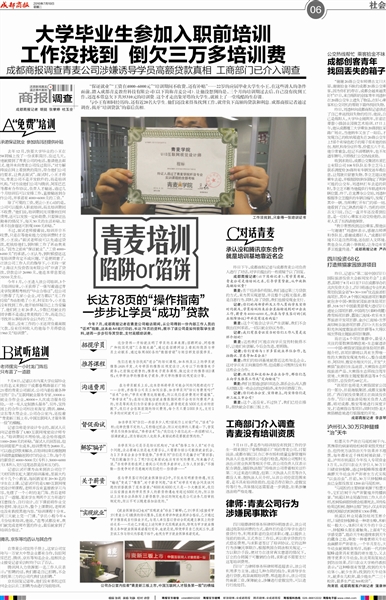 本报对成都青麦公司以“保证就业”、“工资4000~6000元”为承诺,诱导学员办理高额贷款参加公司培训,但培训结束后不仅工作没找到,还倒欠数万元培训费一事,进行报道。锦江区市场与质量监督管理局工作人员立即介入调查。
