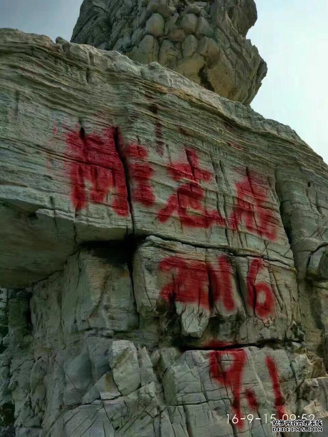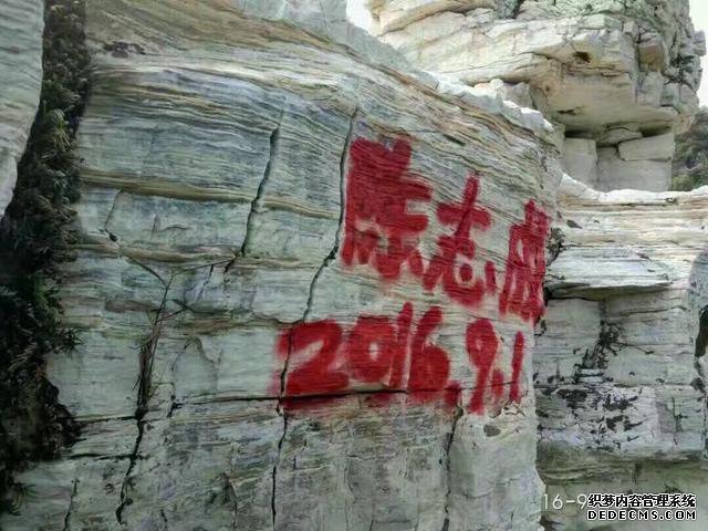 从昨天开始,一则谴责游园不文明行为的帖子引发广泛关注。网友zhdq在微信公众号平台“格图”上发出4张醉石林被喷上红色涂料的照片。照片显示,醉石林的景观石上被喷上了“陈志成2016.9.1”、“沧海桑田掀巨变造就嶙峋乱石山”等字样。这些字的落款都有陈志成的名字,且日期均为2016年9月1日,可见这是一个叫陈志成的人在9月1日涂鸦的。