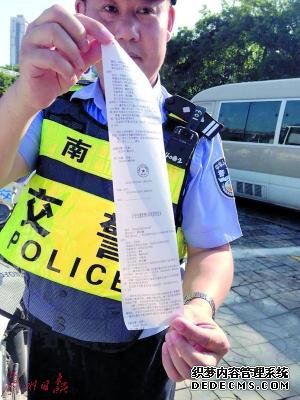 交警展示首张冲绿灯被罚款的罚单。广州日报记者轩慧 摄