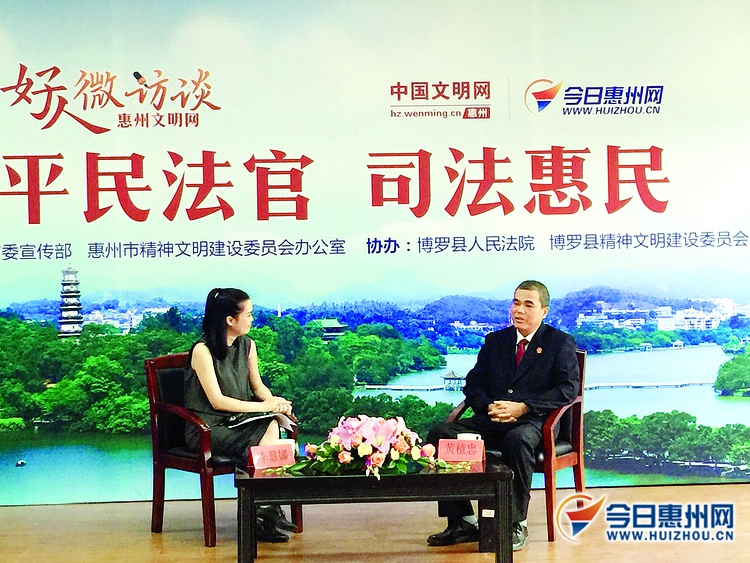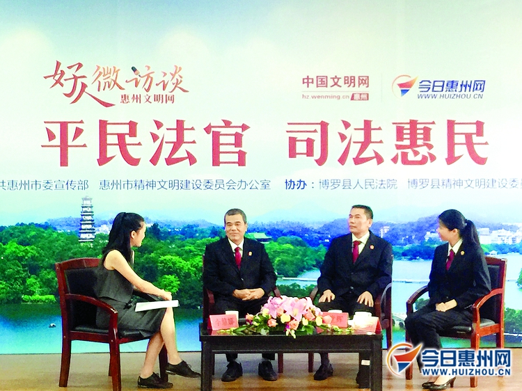 活动邀请了惠州“中国好人”代表、博罗县人民法院审判委员会委员、园洲人民法庭副庭长黄植忠,博罗县人民法院审判委员会委员、园洲人民法庭庭长叶堂辉,博罗县人民法院刑事审判庭法官王渊三位嘉宾,以“平民法官司法惠民”为主题与网友进行交流互动。