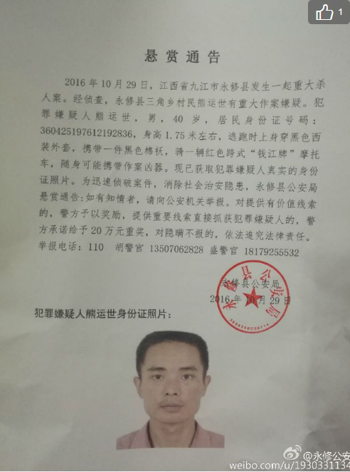 据永修警方29日晚发布的悬赏通告,犯罪嫌疑人系当地三角乡村民熊运世,男,40岁,身份证号360425197612192836,身高1.75米左右,逃跑时上身穿黑色西装外套,骑一辆红色跨式“钱江牌”摩托车,随身可能携带有作案凶器。