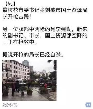 今天中午,朋友圈流传一条消息:四川攀枝花市国土资源局长在宾馆开枪击毙攀枝花市委书记张剡,攀枝花市长李建勤腹部中弹两枪,正在医院抢救。国土资源局长自杀身亡。