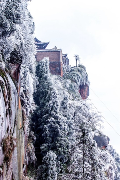 叙永丹山景区位于叙永县城东北约12公里,以“红岩霁雪”被列入“永宁八景”之首,其主峰紫霞峰海拔1600多米,山峰俊俏挺拔,林木葱茏,植被将整个山峰包裹,山间涧瀑从岩峰直泻而下,形成独特的丹霞奇观。每至冬日,天降瑞雪,银装素裹,唯紫霞峰赤壁雪不留痕,白里透红,更显雪白、壁赤,呈“红岩霁雪”之美景,素有川南“小峨眉”之美称,吸引了众多游客前往观赏。