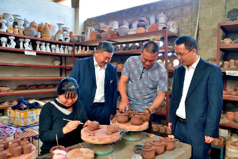 康建洪正在向信用社客户经理介绍康庄农业观光公司手工土陶产品生产情况。