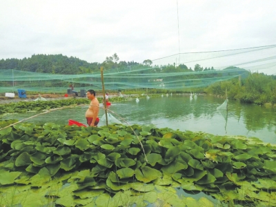 8月11日,龙台河饮用水取水口对岸,泥鳅养殖场老板正冒雨打捞池塘中的泥鳅。“至少还要一个月才达到销售要求,但要配合整改。”养殖场老板说。