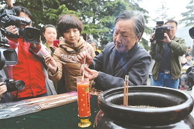 清明节当天,南京大屠杀幸存者夏淑琴带着家人祭奠遇难同胞。新华报业视觉中心记者 万程鹏摄