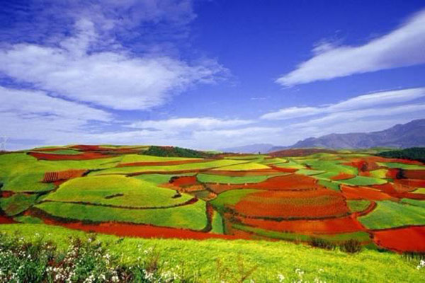 被认为是全世界除巴西里约热内卢外最有气势的红土地,而其景象比巴西红土地更为壮美。这是一个被上天遗失在中国的调色板!5月份是来这里的好时节,放眼望去,山川和原野呈现出一片片暗红、紫红、砖红等不同的红色,方圆数百里大大小小的各个山头、山坡上,油菜花、洋芋花热烈地绽放,金色的麦浪在清凉的山风下一浪掀起一浪,一层绿,一层白,一层红,一层金,鲜艳浓烈的色块一直铺向天边,看似漫不经心,却又形成如画般五彩缤纷的图案。仿佛上天涂抹的色块,有着优美的线条,又勾画得如此浓墨重彩。