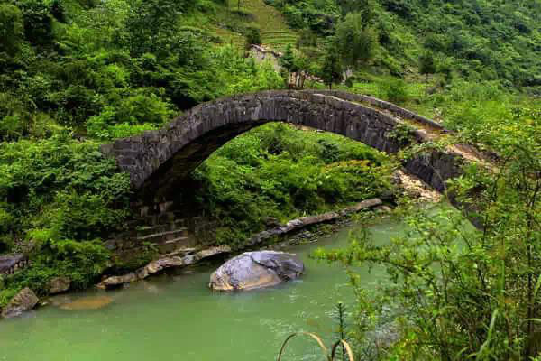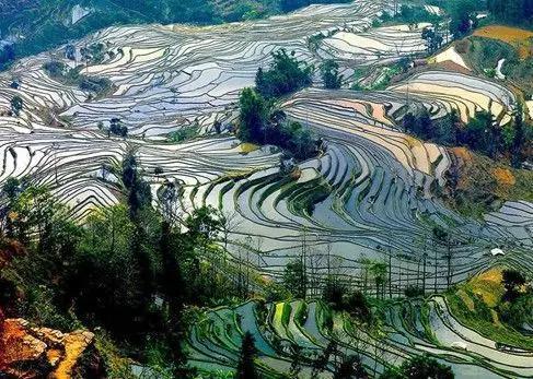 被誉为世界梯田之冠的龙脊梯田,每到5月农耕时节,人们在这里灌水插秧,层层梯田绿浪翻涌,如行云流水般倾泻而下,从山顶盘绕到山脚,垂直落差达500多米,蔚为壮观,演绎着世外桃源般的古朴田园诗。清晨的时候,薄雾从山间升腾,艳阳照耀下的梯田闪闪发光,波光潋滟,犹如一环环晶莹的银带,磅礴壮美得让人惊艳。