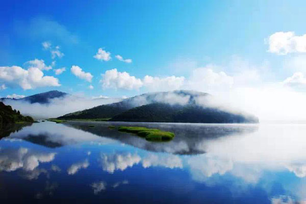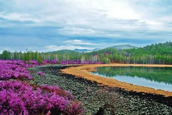 值5月中旬,姹紫嫣红的兴安杜鹃衬着尚未完全消融的皑皑白雪,在沉睡九万多年的玄武岩上怒放。红色杜鹃花和白色的积雪交相辉映,错落有致地分布着,苑若仙境。所以,这里也称“杜鹃花山谷”。连绵十几公里的红杜鹃密密匝匝,争奇斗艳,宛若一片火红的海洋。它们又与高耸挺拔的松柏、洁净如雪的白桦相伴相生,相互辉映。林区的景观总是让人着迷,太阳在达尔滨湖上空升起又落下,漂亮的霞光印染在湖面,如同仙境。