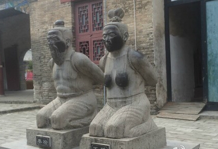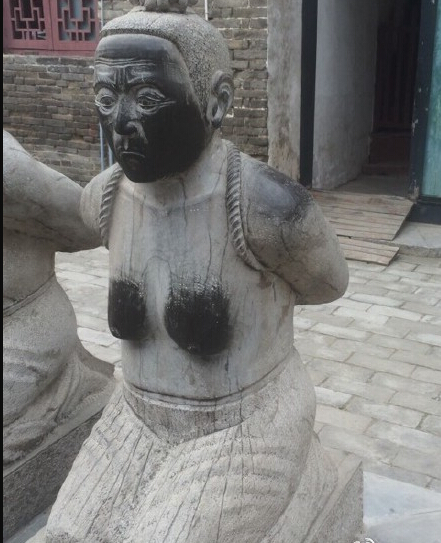 秦桧和王氏夫妇的雕像同跪在地,王氏的胸部光滑异常,明显被摸黑。