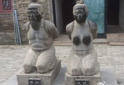 近日,有网友在安徽亳州的岳飞庙看到这样一幕,秦桧和王氏夫妇的雕像同跪在地,王氏的胸部光滑异常,明显被摸黑。