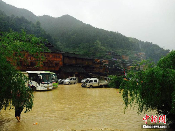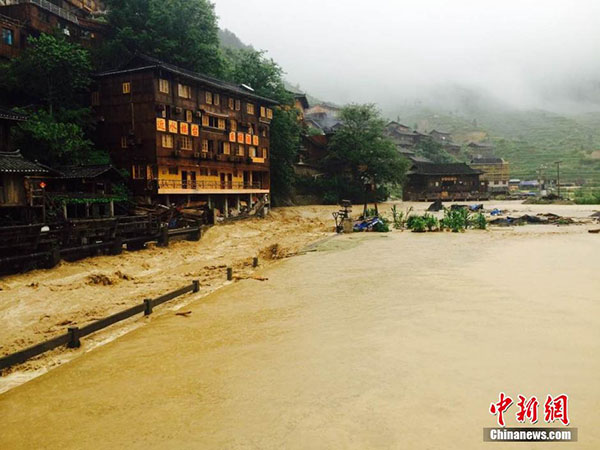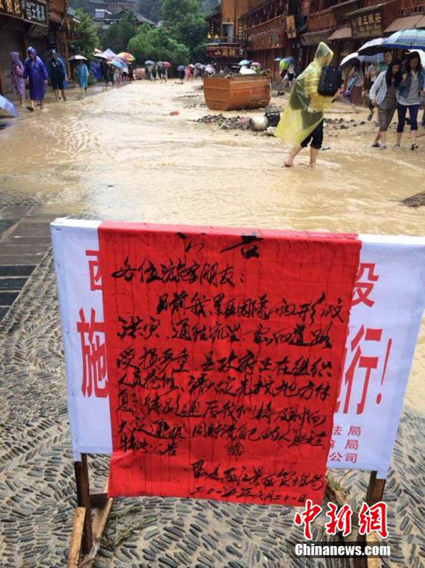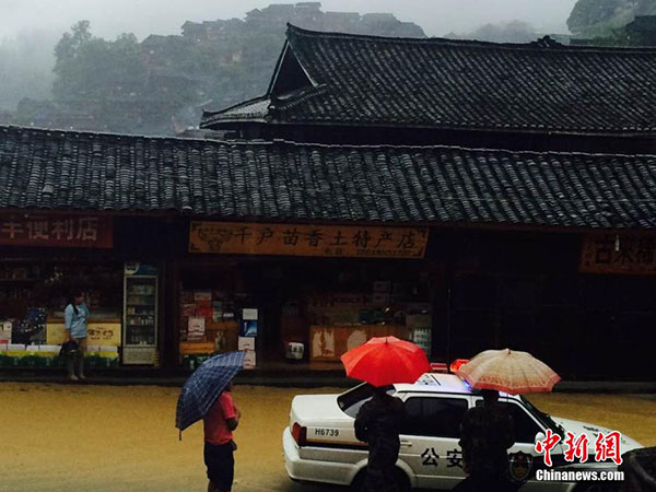 贵州省雷山县6月20日晚至21日14时,出现连续降雨,该县境内丹江、西江等乡镇遭受大暴雨袭击,西江千户苗寨景区部分路段因塌方交通中断。目前,西江景区游客滞留,景区道路、桥梁受损严重。正在组织力量抢修中。中新社发 何春 摄