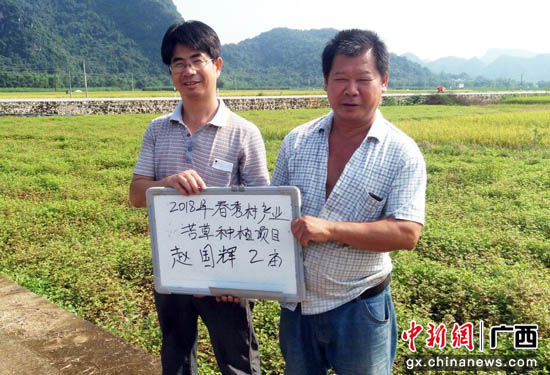 龙州县下冻镇春秀村驻村第一书记农有文(左)入户验收枯草种植产业项目。
