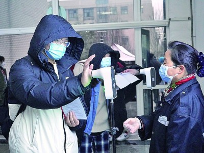 12月25日,考生在西安石油大学考点测温。赵喜军摄/光明图片