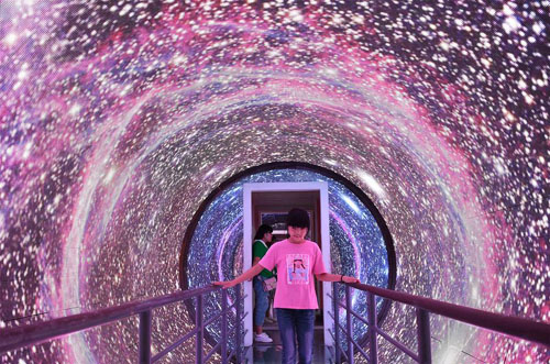 7月11日,小朋友在贵州省科技馆体验时光隧道。新华社发 责编:玉玲...