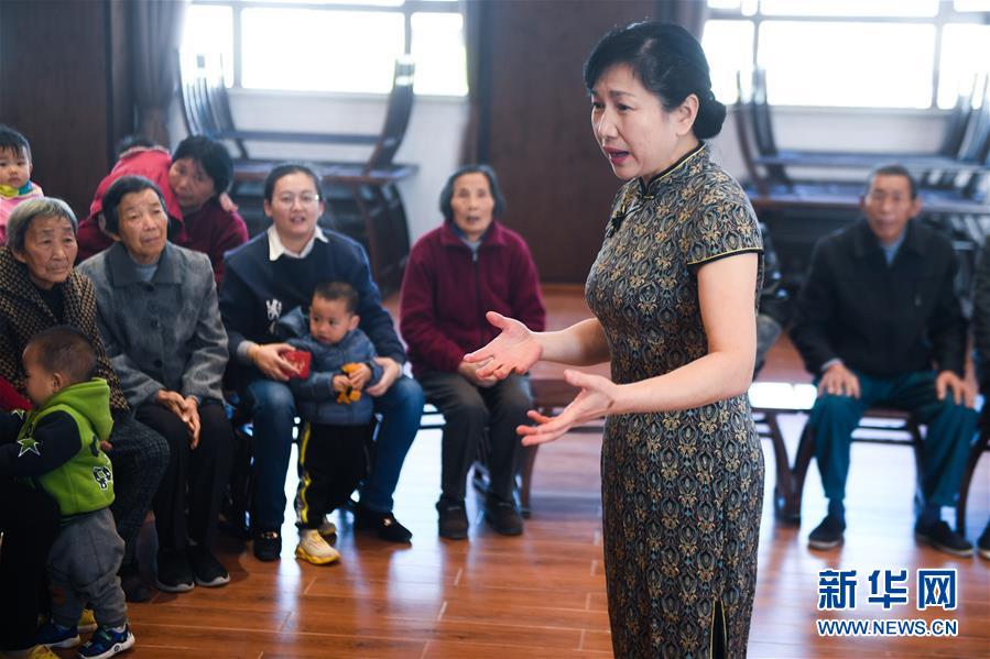 11月20日,志愿者故事员钟红梅在塘栖镇丁河村文化礼堂给村民们用方言讲诚信守法的故事。 新华社记者 徐昱 摄
