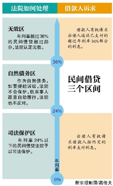 原标题:民间借贷年利超36%无效 最高法发布司法解释,设定民间借贷三个区间,控制高利贷 新京报讯(记者邢世伟)昨日,最高法院发布《最高人民法院关于审理民间借贷案件适用法律若干问题的规定》(点击查看全文),自今年9月1日起施行。 根据新司法解释,民间借贷年利率超36%的,超过部分法院可认定为无效。 年利率24%以下受保护 新司法解释的一个重点就是对民间借贷利率进行规制。 最高法院审判委员会专职委员杜万华解释说,司法解释设定了民间借贷利率的三个区间。第一个是司法保护区,年利率24%以下的民间借贷法院予以司法保护。第二个是无效区,年利率超过36%的民间借贷超过部分法院将认定无效。第三个是自然债务区,即年利率为24%至36%,这个区间作为一个自然债务,如果要提起诉讼,要求法院保护,法院不会保护你,但是当事人愿意自动履行,法院也不反对。 杜万华表示,这三个区间的设定是根据我国从古到今利率和1990年以来央行贷款基准利率的变化得来,既能从司法层面保证民间借贷的正常运转,又能控制住高利贷。 P2P网贷平台提供担保应担责 对于目前兴起的P2P网贷,新司法解释规定,借贷双方通过P2P网贷平台形成借贷关系,网络贷款平台的提供者仅提供媒介服务,则不承担担保责任,如P2P网贷平台的提供者通过网页、广告或其他媒介明示或有其他证据证明其为借贷提供担保,根据出借人的请求,法院可判决P2P网贷平台的提供者承担担保责任。 针对涉嫌非法集资犯罪的民间借贷案件,司法解释也明确,法院应不予受理或驳回起诉,并将涉嫌非法集资犯罪的线索、材料移送公安或检察机关。对于与民间借贷案件虽有关联,但不是同一事实的犯罪,法院应将犯罪线索材料移送侦查机关,但民间借贷案件仍继续审理;借款人涉嫌非法集资等犯罪或生效判决认定其有罪,出借人起诉担保人承担民事责任的,法院应予受理。 |