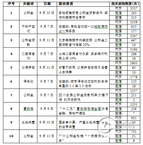 注:以上数据源自房观察数据研究中心对42家主流媒体一周(2015年9月7日-2015年9月11日)新闻监控。 1.多地密集放宽公积金贷款条件 或将刺激楼市去库存 摘要:近日,住建部、财政部与央行发布通知称,9月1日起,调整住房公积金个人住房贷款购房最低首付款比例,拥有1套住房并已结清购房贷款的公积金最低首付款比例由30%降低至20%。事实上,早在政策出台之前,南京、西宁、山东等全国多地早已密集调整了公积金政策,包括“公积金贷款转商业贴息贷款”“公积金即提即贷”“提高公积金贷款额度”等诸多具体措施。业内专家表示,目前楼市在成交量、价格方面都有走强趋势,各地密集调整公积金政策等利好政策,将推动楼市进一步去库存化。 2.住建部:房地登记统一以地控房防止一房多卖 摘要:国土资源部和住建部近日联合发出《指导意见》,要求各地做好不动产统一登记与房屋交易管理的衔接。《指导意见》明确:“房屋登记等不动产登记职责将统一整合到不动产登记机构,房屋交易管理职责继续由房产管理部门承担。”这意味着,不动产登记分工已经明确。 3.北京再推楼市刺激政策 公积金二套贷款首付降至20% 摘要: 北京公积金管理中心9月11日通知称,自9月14日起,对已有1套住房并已结清相应住房公积金个人贷款(含住房公积金政策性贴息贷款)购买第二套住房的借款申请人,执行第二套住房贷款政策,最低首付款比例由30%降低至20%。 4.上海二套房首付收紧 多家银行利率上浮10% 摘要:受“3•30新政”影响,上海二套房首付比例曾一度低至三成,从本月起,渤海银行从三成提至七成,至此二套房首付最低三成销声匿迹。利率方面,除华夏银行(600015,股吧)、广发银行、友利银行维持基准利率以外,其余23家银行利率均为在基准利率基础上上浮10%。 5.好看不好用 以房养老政策只是看上去很美 摘要:以房养老是跨资本市场和房地产市场的一种资源配置方式,在国内起步时被当作养老模式的一种有效补充而备受期待。但记者走访北京、上海、广州、武汉等试点城市发现,政策试点一年后遇冷已成现实,究其原因主要受传统养老观念、政府相关政策配套、不动产价值增贬预期、产权处置等因素影响。那么,以房养老政策真的就“好看不好用”? 6.住建部:城市停车位应在机动车保有量的1.1至1.3倍间 摘要: 住建部城建司副司长刘贺明在6日举行的新闻发布会上说,住建部已于本月初正式印发《城市停车设施规划导则》,立足从规划源头合力配置城市停车设施资源。这也是住建部探索从规划、建设和管理三个环节科学发展城市停车设施的第一步。 7.四川住房公积金贷款利率大幅下调 创历史新低 摘要:成都住房公积金管理中心发布公告称:自8月26日起,下调个人住房公积金贷款利率。其中5年期(含5年)以下个人住房公积金贷款利率由现行的3%下调至2.75%,5年期以上个人住房公积金贷款利率由现行的3.5%下调至3.25%,均创历史新低。 8.“十二五”营改增恐难全面收官 金融、房地产遇阻 摘要: 作为税制改革重要内容,十二五期间“营改增”全面收官的计划可能打折扣。在尚未改征增值税的三大行业中,金融业、房地产业的“营改增”落地遭遇诸多困难。 9.国家审计署:严查土地闲置 背后的监管闲置 摘要:审计署近日发布公告显示,7省市闲置土地盘活不到位,3.6万公顷土地被闲置,其中闲置最多的安徽省超过1.6万公顷;部分地块已闲置9年。一些地方和部门在闲置土地及处置上的不作为、慢作为令人痛心,土地闲置背后的监管闲置必须严查。 10.广州公积金拟推“一手楼快贷业务” 摘要:广州住房公积金管理中心发布最新消息,针对广州市政协委员唐激杨明确住房公积金贷款审批放款时间的建议,表示将采取措施提高审批效率,为了目前贷款审批抵押环节过长的现状,调研后将开展“一手楼快贷业务”,计划选择优质开发商实行提前放款,抵押手续在放款后规定时间内补办。 舆情关注:多地密集放宽公积金贷款条件 观点一:伟业我爱我家集团副总裁胡景晖分析表示,降准降息带来流动性的增加以及融资成本的降低,无疑将间接利好当下楼市,尤其是对进入8月份略显疲态的房地产市场将起到刺激作用,“金九银十”交易量有望再度攀高,而全年楼市成交量或创3年来新高。对购房人来说,改善型购房人群将成为今年楼市新政和4次降准降息利好叠加的最受益人群。本次“双降”将刺激改善型购房需求的持续释放。 观点二:中原地产首席分析师张大伟:降准之后,银行将增加贷款额度,对于购房者来说,首套房的利率折扣将明显增加。“目前一线城市的首套房贷款折扣主流在9折左右,未来有出现8.5折或者8折的可能性。对于购房者来说,这种直接的信贷刺激影响非常大。” 观点三:满堂红市场研究部高级经理周峰担忧,对楼市的刺激效果可以有多久,还是视乎地方政策的配合。在限购严格的城市,降准降息对楼市的影响还是比较有限,或许不如今年年初那一两次降息降准对楼市那么利好。在目前以去库存为主基调的市场大背景下,交易量的回暖并不会引发房价的大幅上涨,房价将相对平稳。 地方政府调增楼市还需新招 中央的降准降息和二套房首付政策调整后,本周国家层面未出台其他重大的楼市政策,住建部不动产登记根据实际情况做出新的调整,以及城市停车位比例等新的规定都未能取得较大的社会