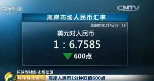受中间价大幅下调影响,离岸人民币北京时间09:16,1分钟内由6.6952元跌至6.7585元,贬值超600点。 分析师:个人投资者应合理增加海外资产 为什么新年一开始,人民币就上演了如此剧烈的行情,未来走势该如何判断,我们一起来听听专业的分析人士怎么说。 进入2016年,人民币对美元汇率中间价已经连续三天下调。1月6日的中间价6.5314,创下2011年4月以来新低,距离去年最后一个交易日,已经累计下调了378个基点。即期市场上,在岸和离岸人民币更是每天波动幅度都在几百点以上。