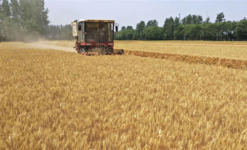 6月3日,在安徽省临泉县周大庄村,农民操作农机收割小麦。 近日,各地小麦进入收获期,农民驾驶农机在金黄的麦田里收获,机声隆隆,一派繁忙。 新华社发(卢启建 摄)