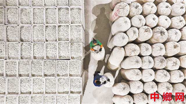 10月13日,黔江区高新区一丝绸公司,工人将烘烤好的晚秋蚕茧打包入库(无人机照片)。