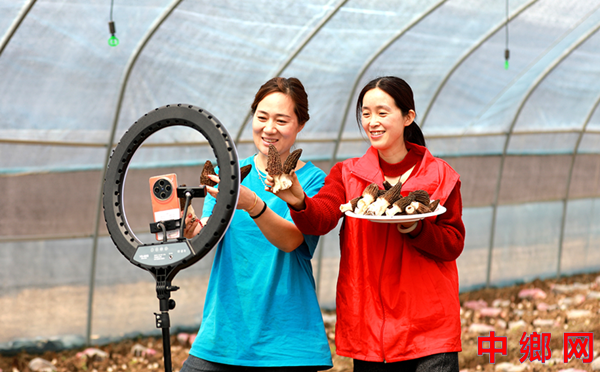 2026年3月21日,安徽省阜阳市颍东区正午镇海明食用菌产业园,青年党员干部通过网络直播,帮助园区推销新鲜羊肚菌。