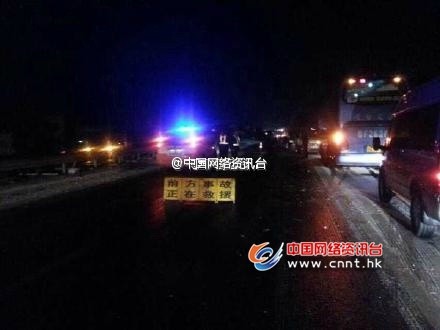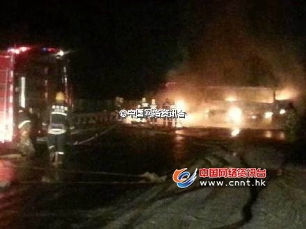 事故现场(图据微博) 突发快讯【荣乌高速莱州段多车追尾发生爆炸 致12死4伤现场图】中国网络资讯台山东莱州1月16日电,今天晚上18时30分左右,荣乌高速莱州服务区南一公里处发生4车追尾相撞交通事故,一辆油罐车、客车和轿车相撞引起爆炸。截目前事故已造成12人死亡、4人受伤。目前事发现场多辆救护车待命。 |
