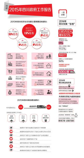 28日,省十二届人大三次会议举行第一次全体大会,省长魏宏作政府工作报告,与此同时,省发改委提请大会书面审议了关于四川省2014年国民经济和社会发展计划执行情况及2015年计划草案的报告。两份报告,均对2015年四川经济社会发展大事要事做了布局,设置2015年我省要完成的“考题”。经济发展进入新常态的大背景和大前提下,我省在“十二五”规划收官之年,定下稳经济,优化升级产业结构,深化重点领域改革,促进农村发展农民增收,进一步开发开放,城乡一体化发展,保障和改善民生,生态环境保护和法治政府建设等九大奋斗任务。
