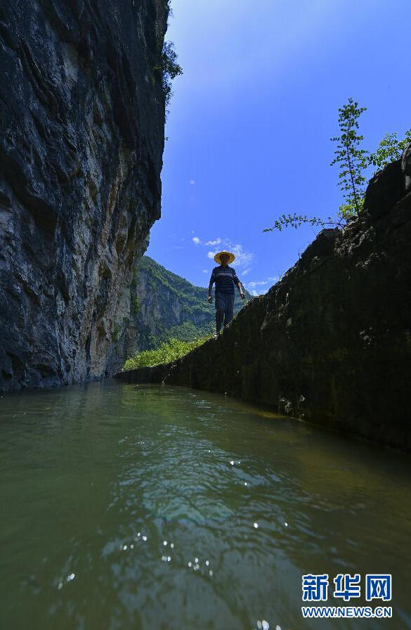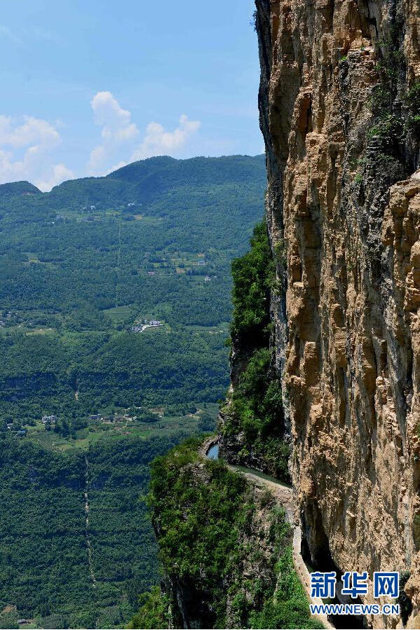 这是7月13日在湖北省巴东县拍摄的“绝壁天河”。新华社发(宋文摄) 在湖北西部深山海拔千米的悬崖峭壁之间,有一条人工开凿的水渠日夜流淌。这条犹如挂在绝壁上的“天河”,被人们称为鄂西深山中的“红旗渠”。这条人工开凿的灌渠位于恩施州巴东县清太坪镇至宜昌市长阳县之间,于20世纪60年代开始修建,历经10多年建设而成。水渠宽约2米宽,紧贴峭壁,依山就势,蜿蜒数十公里。目前,这条绝壁天河仍清流涓涓,水流不息,滋养着沿线的村落人家。 |