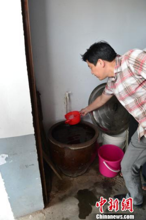 村民用自制水缸过滤水坑里的水 刘康 摄