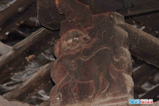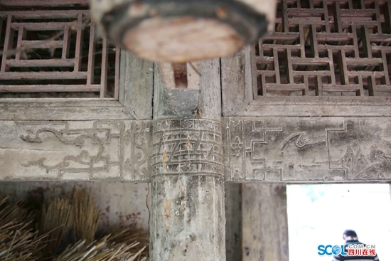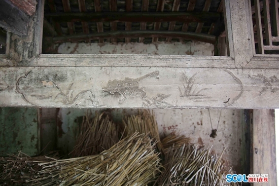 刘存厚宅第的雕刻 此次调查中,四川军阀刘存厚的祖宅也闯入工作人员视线。刘存厚出生于盐商家庭,家境丰厚,曾历任四川督军、国民政府第23军军长等职。上世纪30年代之后,便长期在原籍简阳寓居。姚军透露,刘存厚宅始建于道光年间,在1936年他回简阳后进行过维修。根据调查,原刘存厚宅规模很大,房前约15米处还有一条小溪,被当地人称为“护城河”,跨溪还曾建有一座石桥。虽然房屋在近几十年中不断损毁,但现在仍保存了一进面积达232.45平方米的四合院。四合院现存建筑雕刻精美,门房、正房等柱础上都刻有花卉等图案,“尤其门房后檐额枋等处的沥粉彩绘,原本通常用于祠堂、寺庙等建筑,这还是首次看到出现在四川的民居中。”