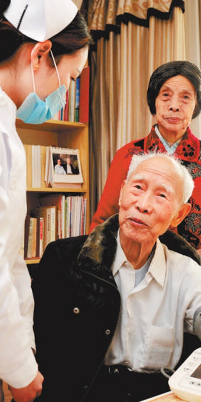 郑州市爱馨阳光城小区,爱馨养老集团工作人员上门为居家老人提供医护服务。人民视觉
