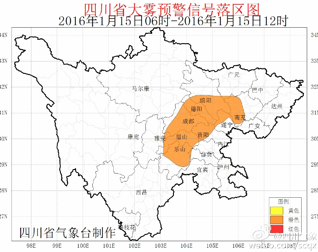 四川在线消息:2016年01月15日06时10分四川省气象台发布第7号大雾橙色预警信号:预计今天早晨到上午,绵阳、德阳、成都、眉山、乐山、南充、遂宁、资阳8市的部分地方有能见度小于200米的大雾,局部地方能见度小于50米。请公众注意大雾天气带来的不利影响。