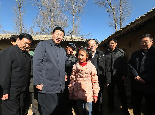 2013年2月3日,习近平来到定西市渭源县田家河乡元古堆村看望乡亲们。这是习近平与一名小女孩亲切交谈。(新华社记者 兰红光摄) 习总书记到元古堆村视察慰问后,当地政府制定《渭源县田家河乡元古堆村扶贫攻坚规划(2013-2020年)》、《布楞沟流域整体联贫扶贫开发实施规划》,村民喜迁新居入住新建成的元古堆村集中安置点,实施“众筹”入股,“能人+贫困户”、担保增信等多种金融扶贫方式。东乡族自治县实施“菜单式扶贫”,全县被列为甘肃省“1236扶贫攻坚计划”的7个试点县之一, 通过筹资、融资并举的方式,在三年时间内所有行政村通水泥硬化路,破解了农村人畜饮水难题。 三 2013年11月3日至5日,习近平总书记到湖南湘西土家族苗族自治州花垣县排碧乡十八洞村调研民族地区脱贫致富之策。十八洞村是处于武陵山区的苗寨,电灯几乎是全村唯一的电器,人均纯收入仅1668元,居民用泥巴和竹篾、木板糊起来做墙壁。 习近平同村干部和村民代表围坐在一起,强调指出,在抓扶贫的时候,切忌喊大口号,也不要定高骛远的目标。扶贫工作,就是要实事求是,因地制宜,分类指导,精准扶贫。