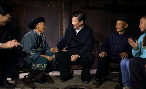 2013年11月3日至5日,中共中央总书记、国家主席、中央军委主席习近平在湖南考察。这是3日下午,习近平在湖南湘西土家族苗族自治州花垣县排碧乡十八洞村苗族村民施齐文家中同一家人促膝交谈。(新华社记者兰红光 摄) 调研过后的十八洞村成立苗绣合作社采取“公司+合作社+农户”的经营模式,并创建苗绣等非遗传承基地,村民共同参股和苗汉子合作社合作,注册成立十八洞村苗汉子果业有限公司,进行猕猴桃产业开发,当地政府加大力度扶持十八洞村开发特色产业,发展乡村文化旅游,将十八洞村打造成苗寨旅游精品村。除此之外,声名远播的十八洞村成为全国扶贫开发可推广可复制的典型。 四 2014年8月3日,云南昭通市鲁甸县发生6.5级地震,地震发生后,习近平总书记第一时间作出重要指示,要求全力以赴做好受灾群众安置和灾后恢复重建工作。5个多月过去了,2015年1月19日至21日,习近平总书记到昭通市查看灾情,并要求将抗震救灾和扶贫开发结合起来。 云南昭通地处全国14个连片特困地区之一的乌蒙山贫困片区腹地,是云南省贫困面最大、贫困程度最深的地区。全市11个县区中有10个县区被列入国家扶贫开发重点县。 调研期间,习近平总书记强调灾后恢复重建和扶贫开发一起抓,并指出扶贫开发是我们第一个百年奋斗目标的重点工作,是最艰巨的任务。他强调现在距实现全面建成小康社会只有五、六年时间了,时不我待,扶贫开发要增强紧迫感,真抓实干,不能光喊口号,决不能让困难地区和困难群众掉队。