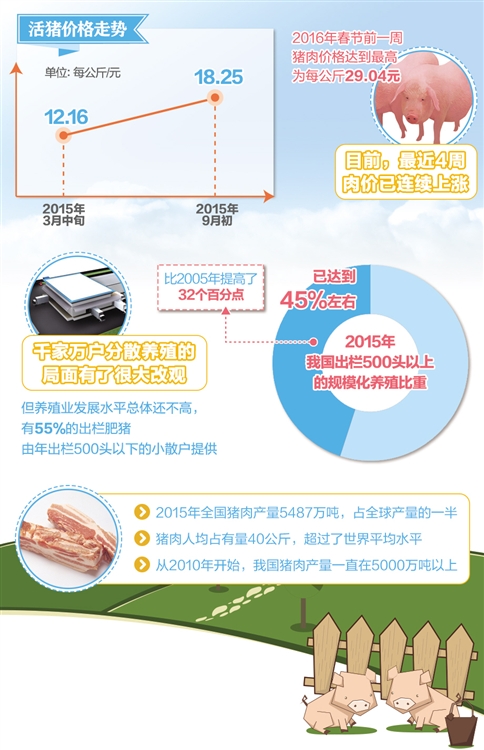 猪肉价格在春节小幅微调后,近期已连续4周上涨,且上涨幅度还不小。从短期看,肉价还有一定的上行空间,但这一上行具有恢复性,长期看猪肉有比较充足的生产能力,而且我国生猪市场形成了非常灵活的调控机制,不会出现大涨大跌的情况—— 猪肉涨价了。为何上涨?今后价格走势如何?市场供应有保障吗?4月7日,农业部就此举行专场新闻发布会进行解读,商务部例行新闻发布会也就肉价波动做出回应。 猪价上涨具有恢复性质 经历近3年的下跌周期后,近来猪肉价格总体呈震荡上行走势。数据显示,这一轮猪价上涨从2015年3月中旬开始,当时活猪价格为每公斤12.16元;当年9月初涨到18.25元,之后小幅下降,后持续小幅上涨至今。猪肉价格在今年春节前一周达到最高,每公斤29.04元,之后下降了一个月,目前已连续4周上涨。 “近期生猪价格持续上涨,总的看,是前3年价格长期低迷的反弹,具有恢复性和补偿性。”农业部畜牧业司司长马有祥分析,本轮猪价上涨的主要原因是前期长时间价格低迷。对于养猪场户,2012年至2013年保本微利,2014年陷入严重亏损,每出栏一头猪亏101元。2014年和2015年两个春节消费高峰期猪价不涨反跌,严重挫伤了养猪场户的生产积极性,导致生猪产能深度调整,目前处于较低水平。 商务部新闻发言人沈丹阳对此持相同看法,他表示,本轮猪价上涨的主要原因是生猪供给减少,而供给减少的主要原因是由于前期生猪养殖长期亏损,因此此次价格上涨也可以看做是生猪市场的一种自身修复行为。值得注意的是,当前生猪出栏价格尚未突破历史高点。上轮周期的生猪出栏价格高点出现在2011年9月7日,为20.21元每公斤,比今年3月份价格高点高6.8%。 生产者和消费者都希望对猪价变化有一个稳定的预期,价格在一定合理范围内波动。马有祥说,猪周期的存在是正常的,是生产者或者消费者对价格作出的不同反应。近10多年来,生猪养殖经过了几个周期,大体上每一次波动都有一定的相同点。其一,直接原因都是因为供给的减少,就是生猪养殖量下降,供不足需。其二,在生猪市场最景气的时候,价格会冲得很高。 猪肉供应不会脱销断档 关于全年的猪价走势,农业部新闻发言人叶贞琴表示,因为养殖效益较好,规模场户补栏积极性开始恢复,有利于增加后期猪肉供应,不会出现脱销断档。尽管猪肉价格在高位运行,可能还要维持一段时间,但伴随着生猪出栏的逐步增加,猪肉价也将逐步企稳,暴涨的可能性不大。 “猪价维持高位应该是今年的常态,但不存在暴涨的基础和动力。”马有祥分析说。首先,生猪生产的三大指标都显示生猪产能在加快恢复。今年1、2月份监测的种猪场二元母猪销量增加了近60%;3月份第4周仔猪价格同比翻了一倍,带动补栏积极性的提高;3月份全国生猪存栏环比增0.9%,母猪存栏在连降近3年后企稳,环比持平。 其次,从养殖成本看,今年饲料成本推动猪价上涨的因素基本不存在。近期猪粮比价达到红色区域,很重要的因素是玉米价格下调。如果按去年玉米价格每公斤2.4元计算,现在的猪粮比价仍处于绿色区间。饲料在养殖成本中所占比重比较高,有60%至70%。现在玉米价格降到2元左右,上涨可能性不大。 此外,生猪疫病情况比较稳定,猪肉消费需求没有大的增长。加之,猪肉的替代产品价格是下行的,禽肉价格基本稳定,牛羊肉和鸡蛋、牛奶的价格都是下降的。 沈丹阳也认为,随着养猪预期效益变好,养殖户扩栏补栏,后期生猪出栏逐步增加,市场供应将趋于平衡。预计2016年全年生猪价格将保持高位运行,但暴涨的可能性不大。 下一步,农业部将通过强化信息监测和预警,加强疫病防控和技术指导服务等多项措施,加快恢复生猪生产。商务部将加大市场监测力度,及时发布市场供需和价格变化信息,引导养殖、加工企业根据市场需求合理补栏,保障市场供应。 转变养殖模式防大波动 数据显示,2015年,我国出栏500头以上的规模化养殖比重已达到45%左右,比2005年提高了32个百分点,千家万户分散养殖的局面有了很大改观。不过,在叶贞琴看来,目前养殖业发展水平总体还不高,生猪养殖户年平均出栏规模比较小,还有55%的出栏肥猪由年出栏500头以下的小散户提供。小规模、大群体的生产格局特别容易出现“一哄而起”“一哄而散”的情况,价格大涨大跌也主要在此,保障均衡供给难度也在此。 去年以来,生猪养殖面临的新情况是限养禁养。从畜牧业发展环境来看,环保压力对规模养殖的约束趋紧。原来农民既种地又养猪,农牧结合、种养循环是传统农业的一大优势,环保压力较小。现在养猪高度专业化分工,经营主体分离后,污染的问题随之即来。尤其是规模化养殖废物处理的规定越来越严,养猪面临的环境压力越来越大。 禁养限养对生猪的调减量影响比较大。据了解,有10个省份已经或者准备启动生猪禁养区的划定,禁养区内的生猪规模场面临拆除搬迁,这大约影响2000多万头的生猪出栏量。“对生猪养殖来说,既要保供给又要保环境,也就是既要吃上猪肉,又要不闻臭味,找这样一个平衡点。”马有祥说,这是生猪产业发展应该正视的问题,如果环保方面不达标,规模养殖可以说寸步难行。 2015年全国猪肉产量5487万吨,占全球产量的一半;猪肉人均占有量40公斤,超过了世界平均水平。马有祥认为,“从2010年开始,我国猪肉产量一直在5000万吨以上,我们有比较充足的生产能力,也有非