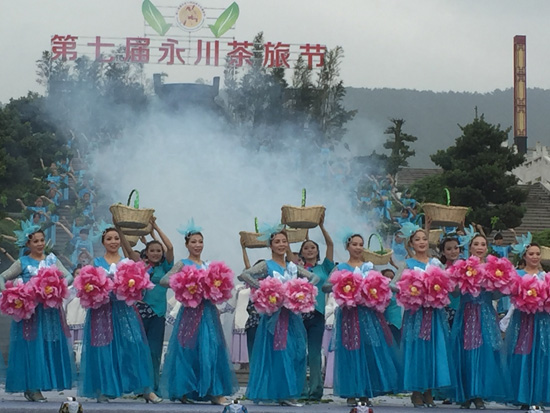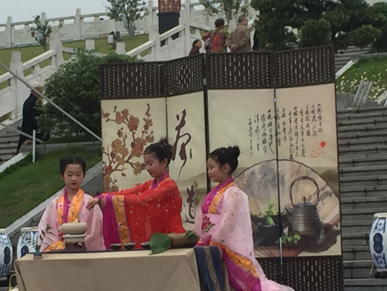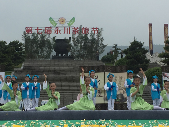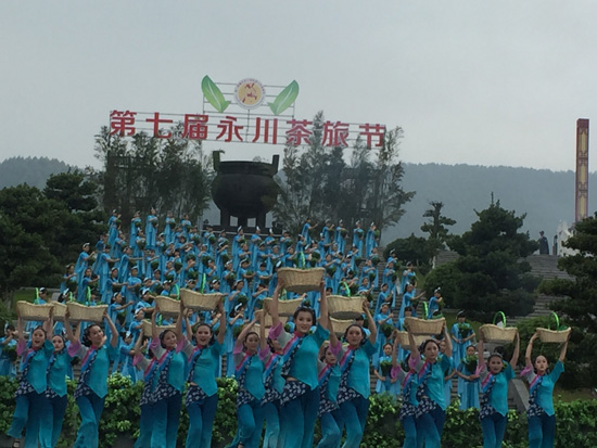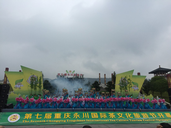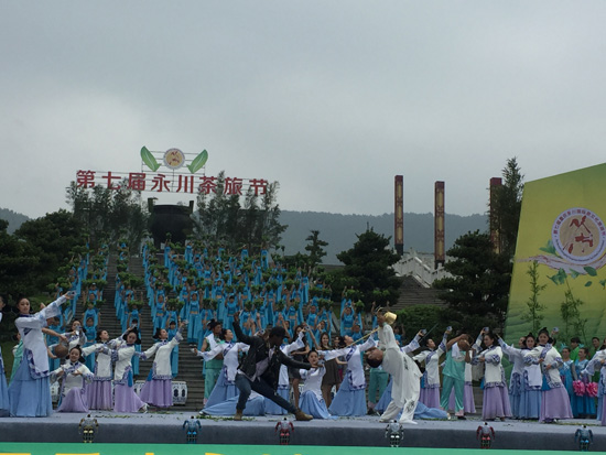 开幕式文艺表演第一篇章《茶颂》,陆羽在教授书童和少儿们吟诵《茶颂》。朗朗的书声、优美的意境,感动了天宫的茶山神女,飘然来到这片人间沃土,拜会陆羽,品味《茶经》。他们以茶为谊,翩翩起舞,演绎一段天上人间的”茶之邂逅”。(本网记者 邓俐摄影) “竹雨松风蕉叶影,茶烟琴韵读书声”。跻身“重庆工业十强”的永川,不仅有令人赞叹的“机器人Style”,更有茶、竹,诗和远方。4月29日,第七届中国重庆(永川)国际茶文化旅游节在薄雾下的神女湖畔幸福广场拉开大幕,八方宾朋齐聚永川“品茶论道”,共享茶旅文化盛宴。 以“茶之味、慢生活”为主题,本届茶旅节上演了美轮美奂的开幕式,从“茶颂”、“开山种茶”、“采茶制茶”、“丰收秀芽”到“永川欢迎您”等五大篇章,浓厚的茶文化深深浸润着一部永川茶史。