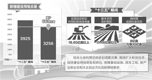 《国土资源“十三五”规划纲要》确定了土地、矿产、地质、海洋、测绘地信5领域18项主要指标,更加突出资源保护,体现资源利用节约集约,为经济社会发展提供资源保障,突出生态文明建设和民生。在节约集约用地要求下,面对“去库存”任务,“十三五”时期全国新增建设用地将比“十二五”减少约669万亩—— 国土资源部近日印发《国土资源“十三五”规划纲要》,为确保18亿亩耕地红线,“十三五”期间将设立的约束性指标包括:全国适宜稳定利用的耕地保有量在18.65亿亩以上,基本农田保护面积在15.46亿亩以上,确保建成高标准农田8亿亩、力争10亿亩。而与“十二五”相比,新增建设用地总量将收紧,控制在3256万亩。 建设用地增加更多靠存量 随着国内一二线城市地价飞涨、地王频出,人们对未来建设用地供应颇为关注。 《国土资源“十三五”规划纲要》提出,将实行建设用地总量和强度双控措施,逐步减少新增建设用地计划,控制单位国内生产总值建设用地强度。这也是我国首次在国家规划中把建设用地总量和单位生产总值建设用地强度作为约束性指标。 在建设用地总量收紧的情况下,未来建设用地将更多依靠存量。《纲要》提出,要盘活存量建设用地,提高存量建设用地供地比重。严格核定各类城镇新增用地,有效管控新城新区和开发区无序扩张。 对于大城市而言,建设用地规模管控将更加严格。前几日,国家发展改革委公布的长江三角洲城市群发展规划显示,目前存在的问题是城市建设无序蔓延,空间利用效率不高。要严控特大城市和大城市的建设用地规模,上海则要实现建设用地规模减量化。 此前,国土资源部部长姜大明在全国国土资源工作会议上也曾表示,对特大城市、超大城市和资源环境超载的城市,我国将加快划定永久性开发边界,形成空间硬约束,其他城市可以分期划定,促进集约发展。 《纲要》提出,“十三五”期间,新增建设用地总量控制在3256万亩。而在“十二五”期间,这一数字是3925万亩。规划同时提出,“十三五”期间,单位国内生产总值建设用地使用面积降低20%。 业内人士分析认为,这意味着新增建设用地规模控制将更加严格,前几年兴盛一时的新城新区和开发区规模无序扩大的势头将被严控。 《纲要》同时提出,要严格控制农村集体建设用地规模,盘活农村闲置建设用地。制定工业用地等各类存量用地回购和转让政策,降低工业用地比例。明确闲置土地认定标准和程序,加快闲置土地处置,严厉打击浪费和囤积土地行为。 而且,这些措施将最终分解落实。《纲要》提出,要把双控目标同经济发展、环境改善、社会和谐目标有机结合。建立目标责任制,纳入经济社会发展综合评价体系,作为考核领导班子和选拔任用干部的重要依据。 深化土地管理制度改革 “十三五”期间,改革已成共识。《国土资源“十三五”规划纲要》提出,审慎稳妥推进农村土地制度改革。总结农村土地制度改革试点经验,推动相关法律法规修订,在全国复制推广。完善土地征收制度,缩小征收范围,规范征收程序,公开征收信息,健全对被征地农民合理、规范、多元补偿保障机制。 同时,将规范农村集体经营性建设用地产权管理,明确入市主体、范围和途径。在符合规划和用途管制前提下,允许农村集体经营性建设用地出让、租赁、入股,建立与国有土地同等入市、同权同价、流转顺畅、收益共享的入市机制。 这一政策实际已在进行之中。6月3日,银监会、国土资源部联合印发的《农村集体经营性建设用地使用权抵押贷款管理暂行办法》提出,具备处分权的两类农村集体经营性建设用地可开展使用权抵押融资,适用范围是此前国家确定的15个农村集体经营性建设用地入市试点地区。 此外,将深化矿产资源有偿使用制度改革。完善矿业权出让制度,制定矿业权出让制度方案,建立符合市场经济要求和矿业规律的探矿权采矿权出让方式,扩大市场化竞争出让范围。以新疆油气勘查开采改革试点为突破口,稳步推动油气资源勘查开采体制机制改革,有序放开油气勘查开采市场。探索建立适合油气勘查开采特点、发挥市场配置资源决定性作用的探矿权竞争性出让制度,引入社会资金,加大油气勘查开采力度。完善勘查区块退出机制,提高探矿权使用费和最低勘查投入标准,促进区块流转。 扩大有效投资保障供应 《国土资源“十三五”规划纲要》提出,要结合土地利用总体规划调整完善,围绕扩大有效投资,加快建设用地审批和供应,保障基础设施、民生工程、新产业新业态和大众创业万众创新用地需求。 事实上,在当前经济下行压力之下,已有多项“稳增长”的用地政策陆续出台。5月,《土地利用总体规划管理办法(征求意见稿)》对外发布。同时,国土资源部下达了今年的全国土地利用计划,明确要求重点支持基础设施建设,重点保障交通、水利、能源等基础设施和军事建设;土地计划将向中小城市和特色小城镇倾斜,向发展潜力大、吸纳人口多的县城和重点镇倾斜;保障养老、旅游、物流、光伏等产业,以及新产业新业态和大众创业、万众创新发展用地等。 国土资源部规划司副司长鞠建华表示,为有序拓展建设发展空间,“十三五”期间将支持公共交通设施用地立体综合开发,落实铁路建设土地综合开发政策。完善政府与社会资本合作模式(PPP)用地政策,支持创新融资