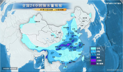 人民网北京7月14日电(李楠桦)中国天气网消息,长江中下游地区在经历了短暂的降雨间歇期后,昨天开始,新一轮强降雨自西向东逐步展开。预计,未来三天,四川盆地、江汉、江淮、江南北部等地将有大到暴雨,局部大暴雨,其中今明天雨势最强。目前,长江中下游干支流、太湖流域多个站点水位超警戒,此轮降雨将加剧上述地区的防汛压力。